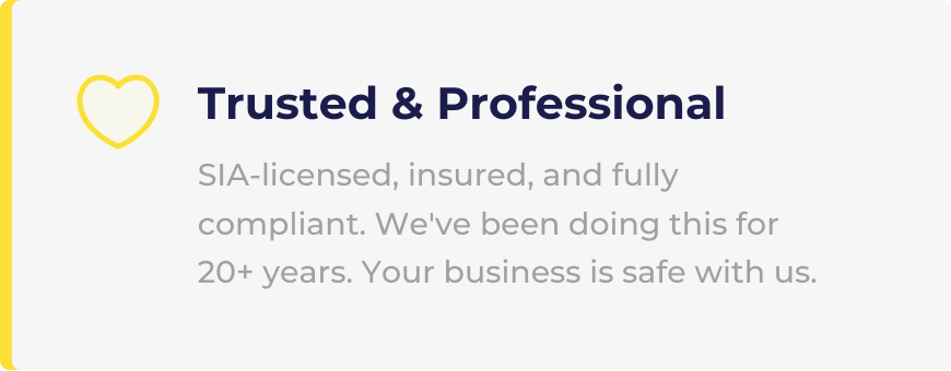 Protect your business 24/7. From uniformed guards to CCTV monitoring, we’ve got you covered. SIA-licensed, fully insured, rapid response.